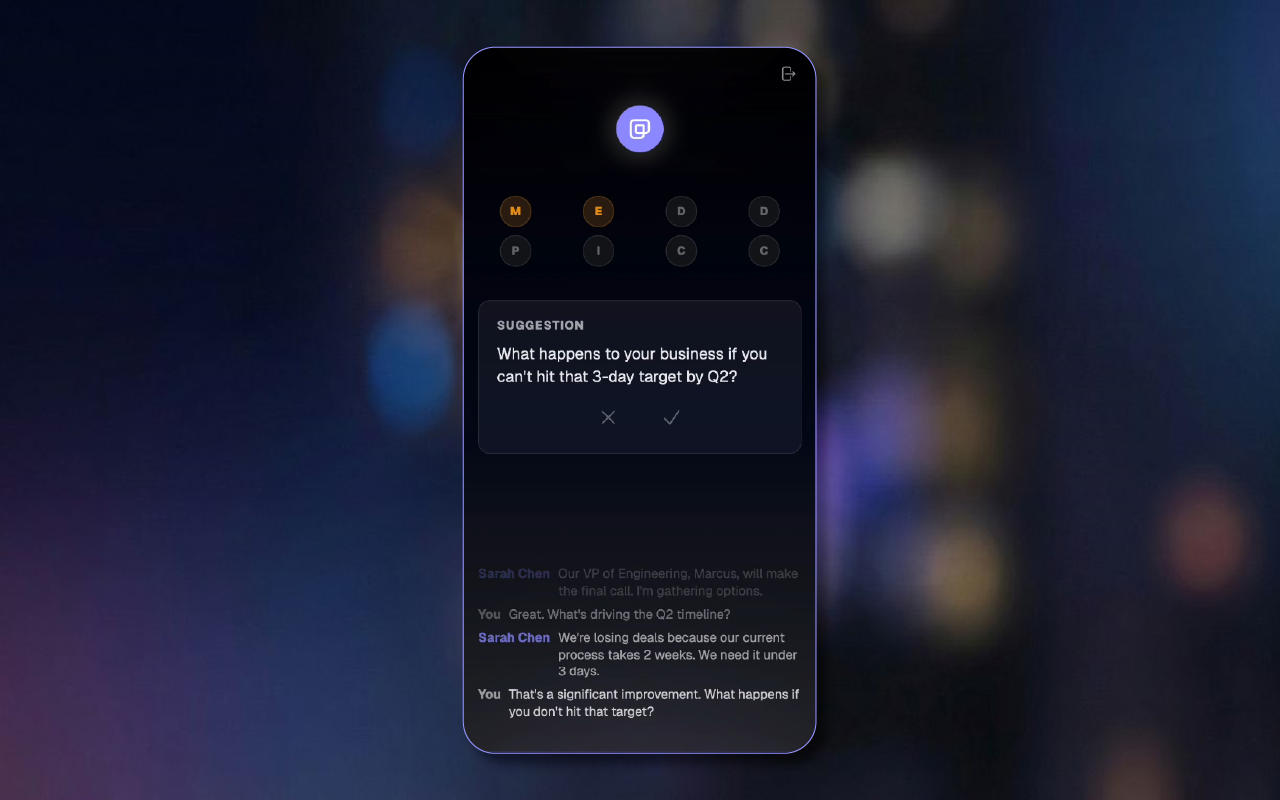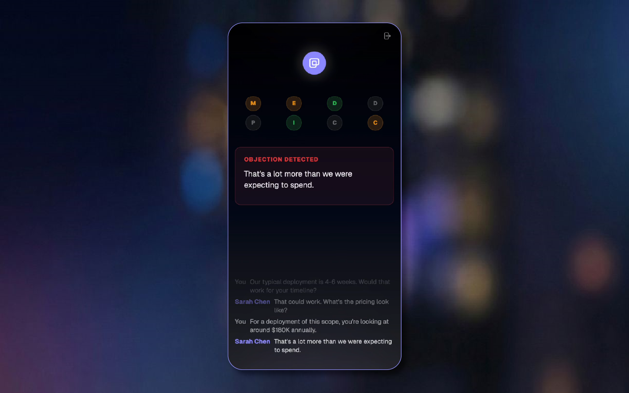 Live qualification scoring, suggested questions, and objection responses — visible only to the rep. Works across Google Meet, Zoom, and Teams.
